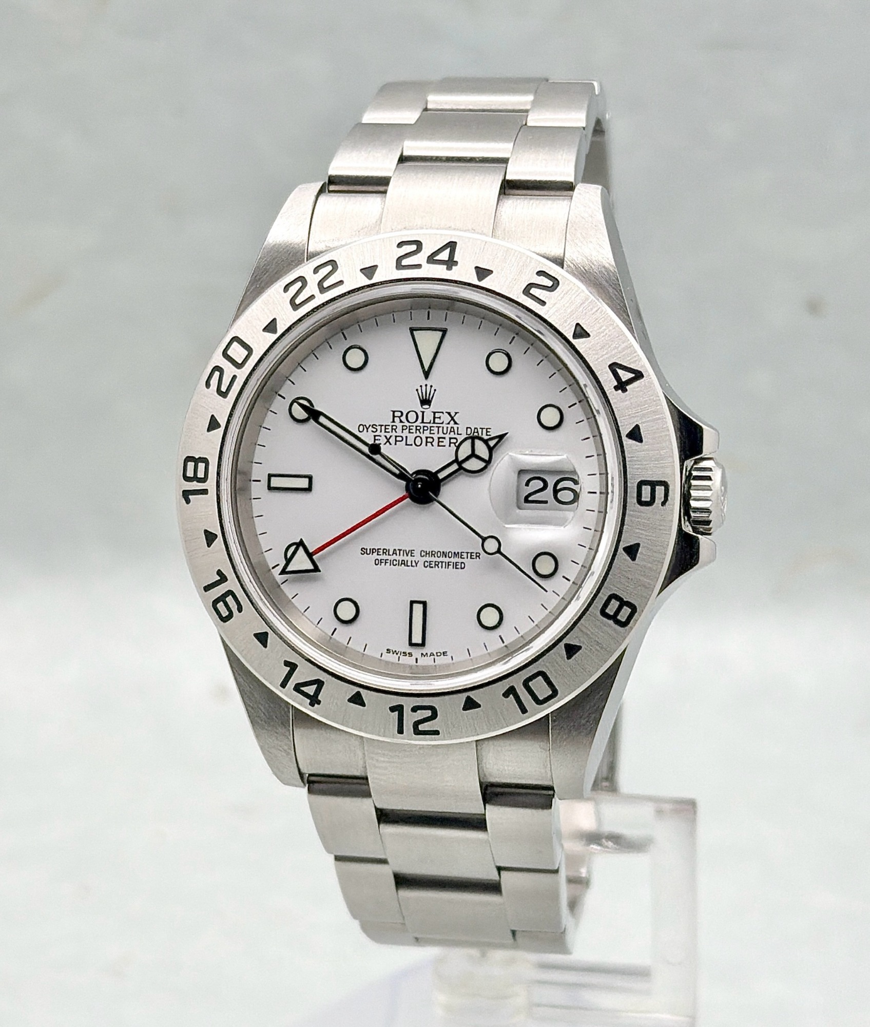 The Rolex Explorer II Polar is an adventure-ready classic with a crisp white dial, bold markers, and its signature red 24-hour hand for GMT tracking.