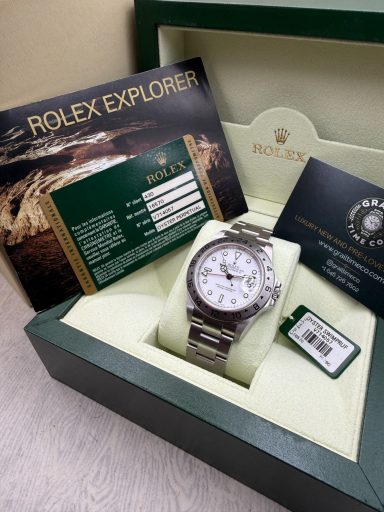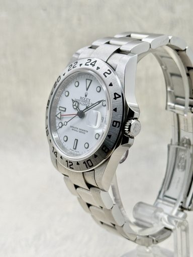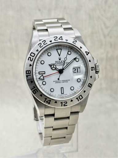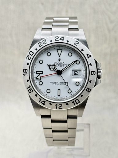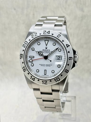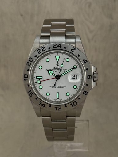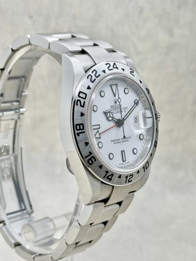 The Rolex Explorer II 16570 is the ever popular reference, known for its crisp white “Polar” dial and robust stainless steel case.