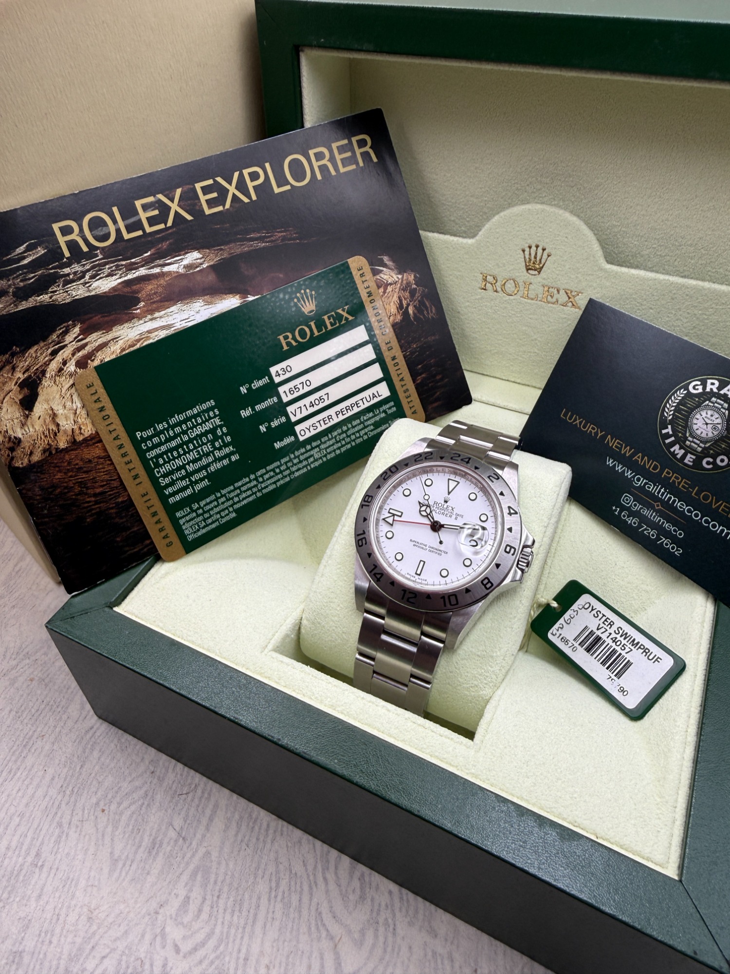 Watch comes with original 2011 warranty card, inner and outer boxes, Explorer booklet, barcode swing tag and Grail Time Co watch roll.