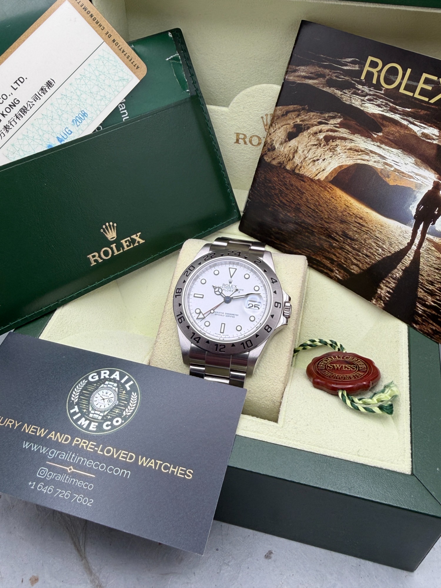 Watch comes with original 2008 warranty card, inner and outer boxes, red swing tag, Explorer booklet and Grail Time Co watch roll. Fits upto a 7.75" wrist.
