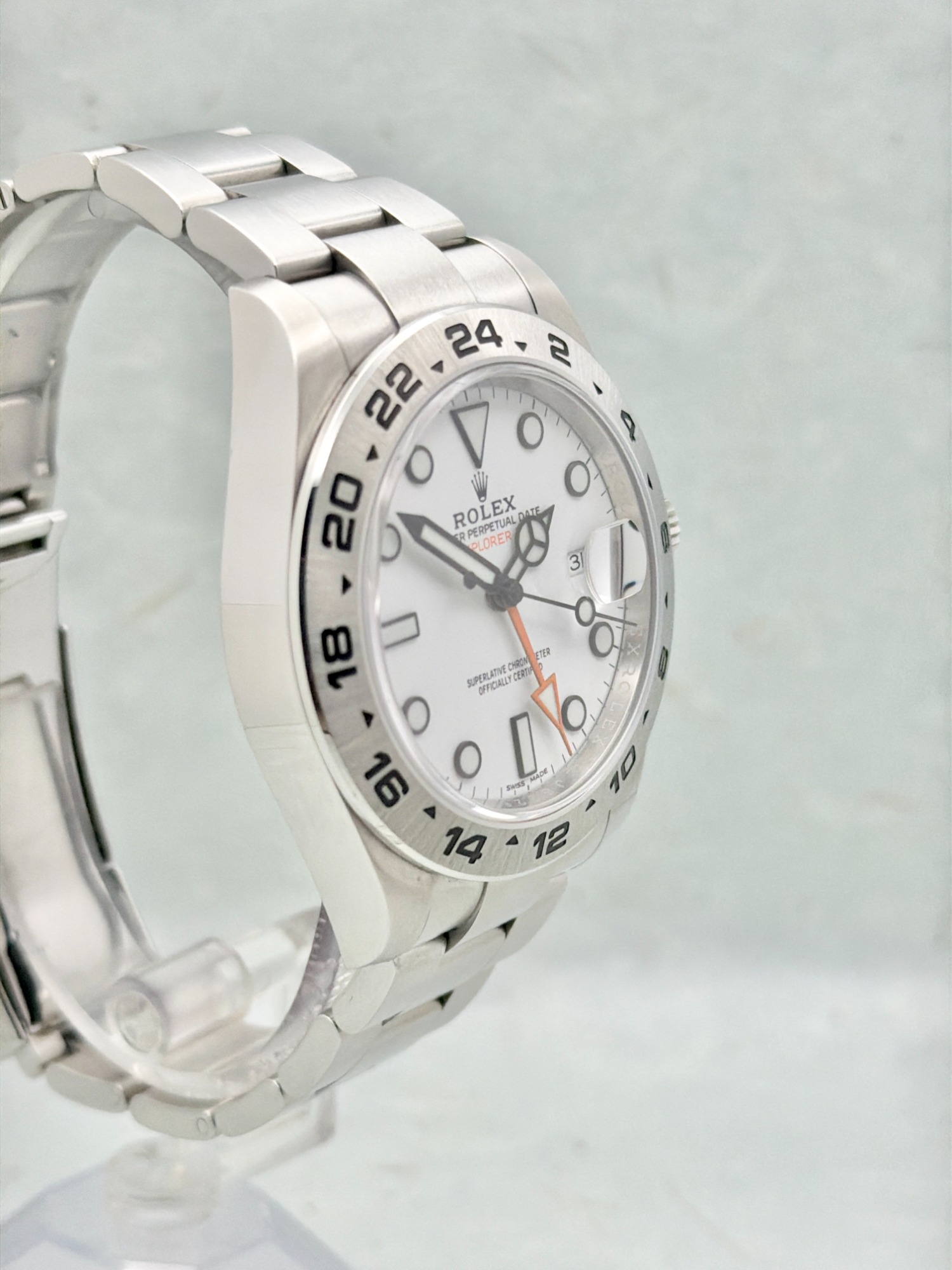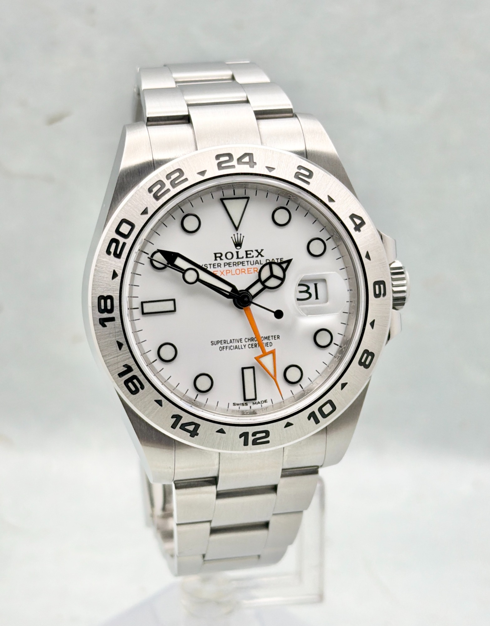 Adventure-ready and iconic, the Rolex Explorer II 216570 features a robust 42mm Oystersteel case, a crisp white "Polar" dial, and a signature orange 24-hour hand for tracking a second time zone.