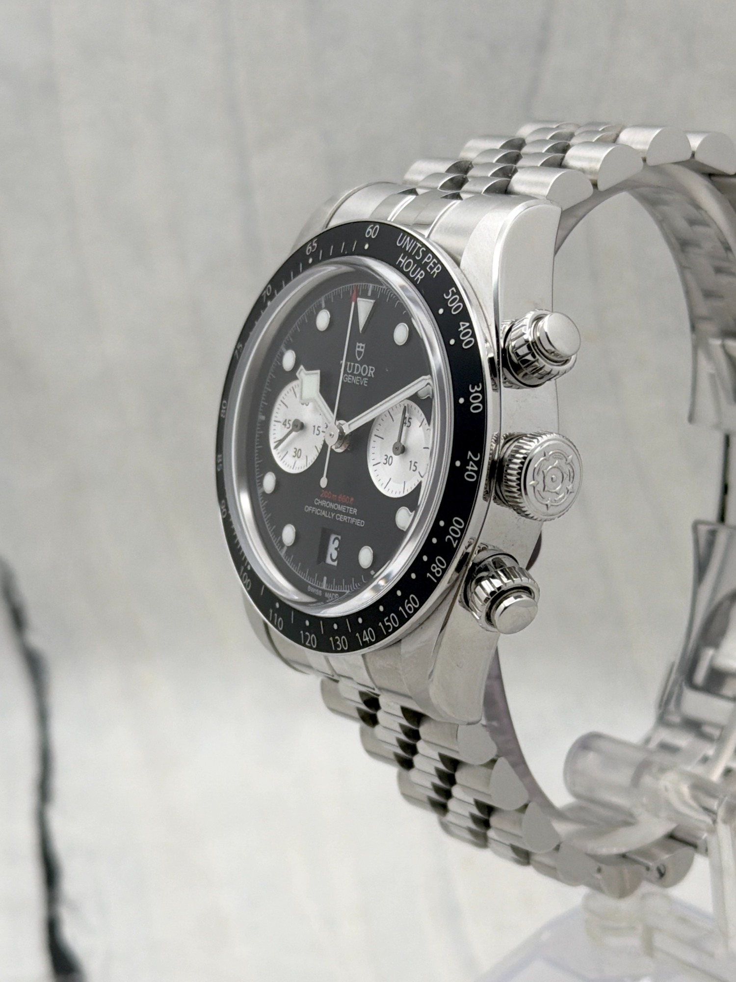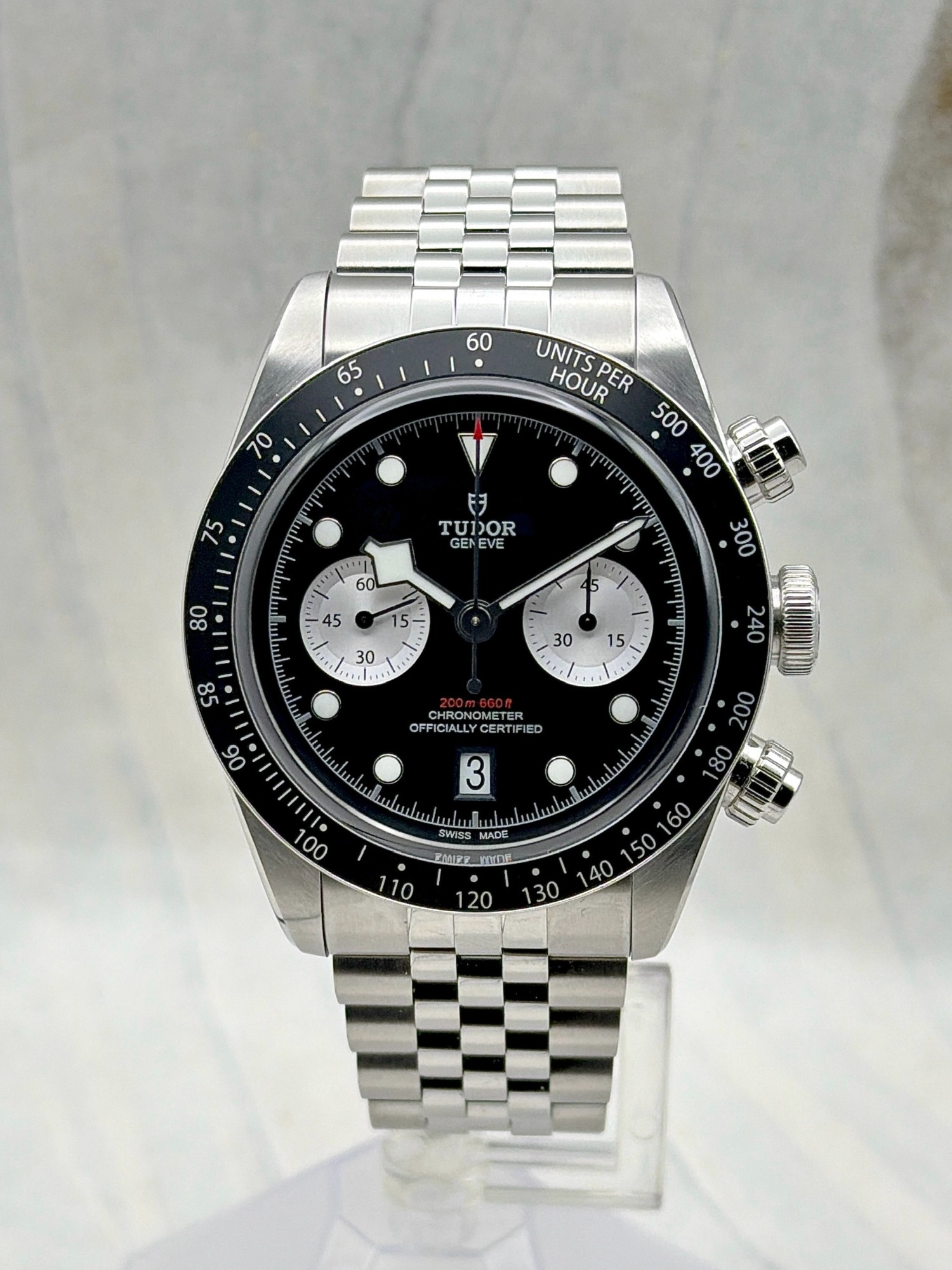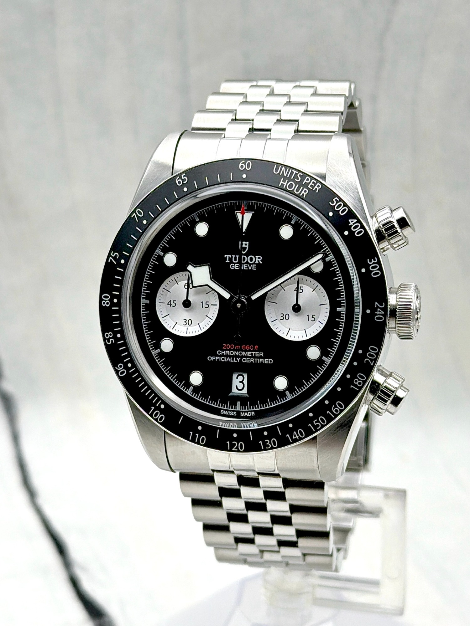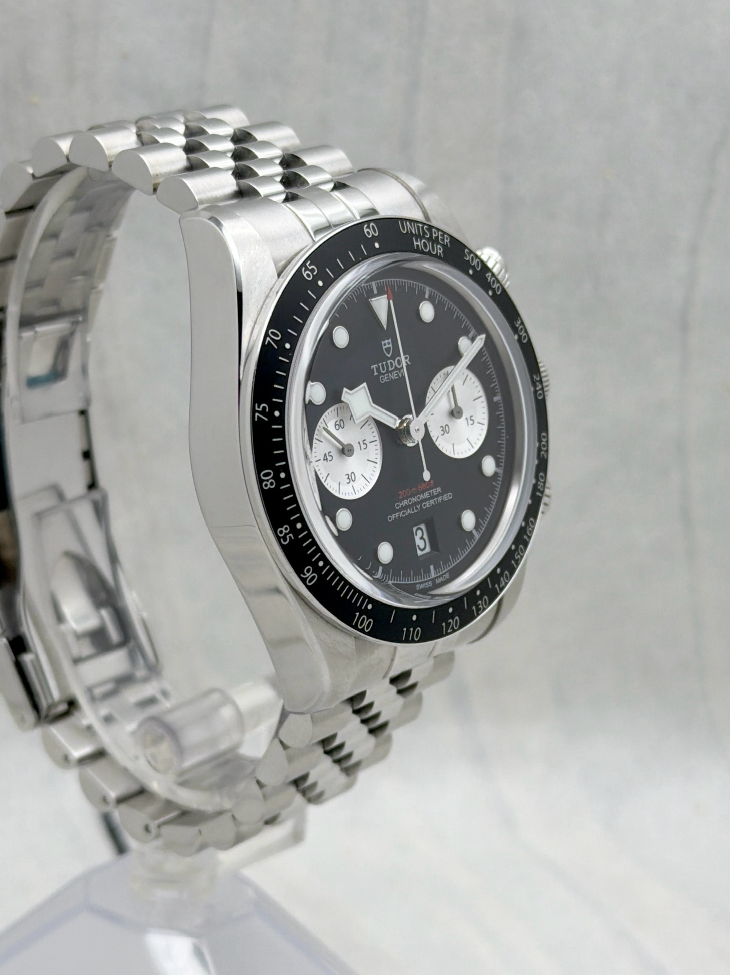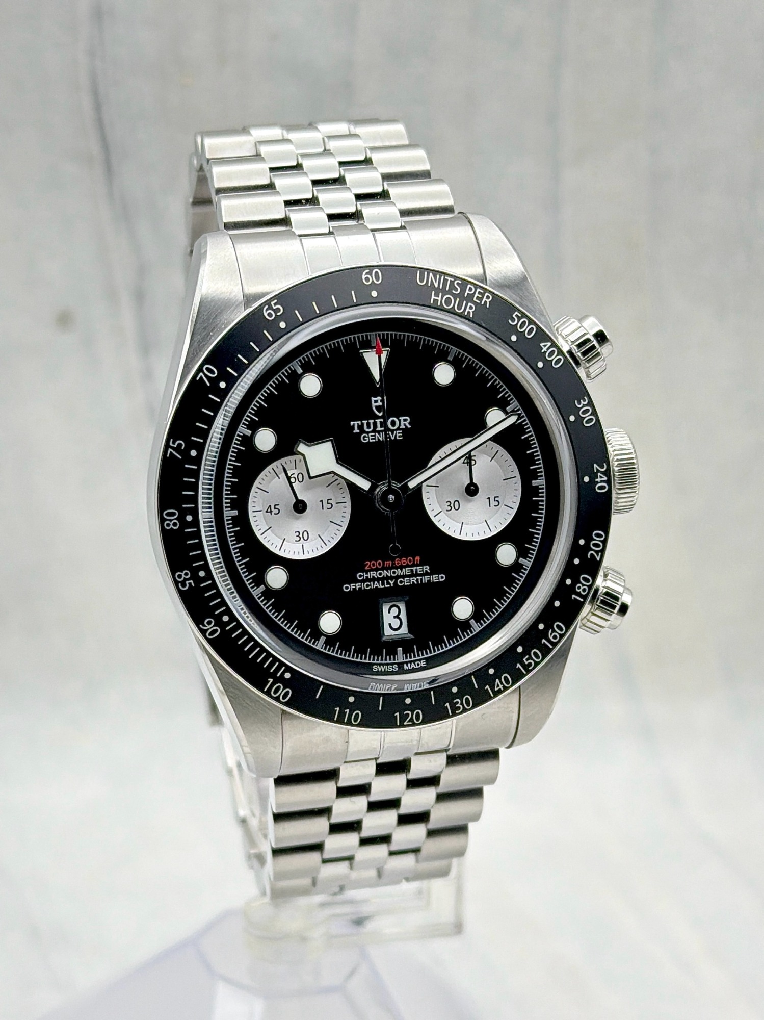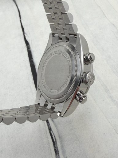 The Tudor Black Bay Chrono 79360N is a bold fusion of dive watch heritage and motorsport spirit. Crafted in a 41mm stainless steel case with a black anodized aluminum tachymeter bezel, it features the signature snowflake hands and contrasting chronograph sub-dials.